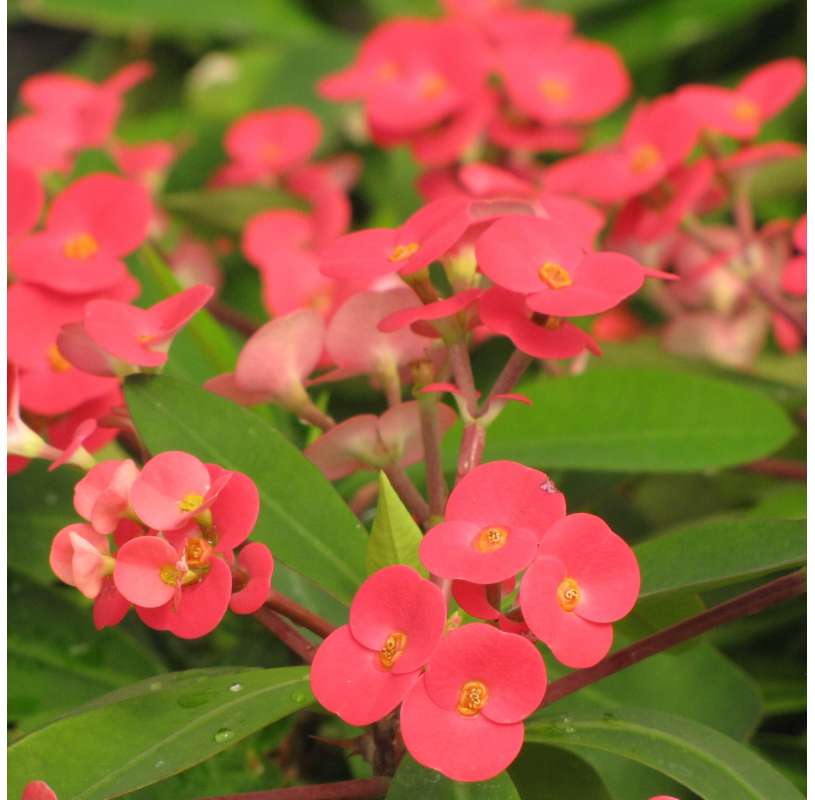 Planta suculenta muy ornamental, apreciada por su follaje reducido y tallos espinosos y sus flores pequeñas y duraderas en tonos rojo, rosa, blanco o amarillo 🌸. Puede alcanzar entre 30 y 90 cm de altura, ideal para macetas, jardineras, patios y rincones muy luminosos. Muy valorada por su resistencia, efecto decorativo duradero y bajo mantenimiento.